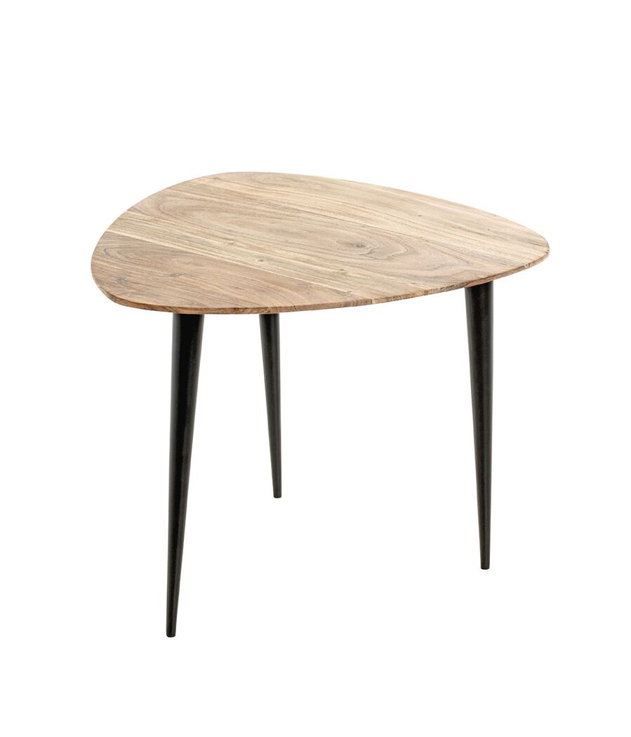 De bijzettafel Kalkutta combineert de warme uitstraling van massief acaciahout met een strak zwart metalen onderstel. Het organisch gevormde tafelblad geeft elk stuk een unieke look, terwijl de slanke poten zorgen voor een luchtig en modern geheel.