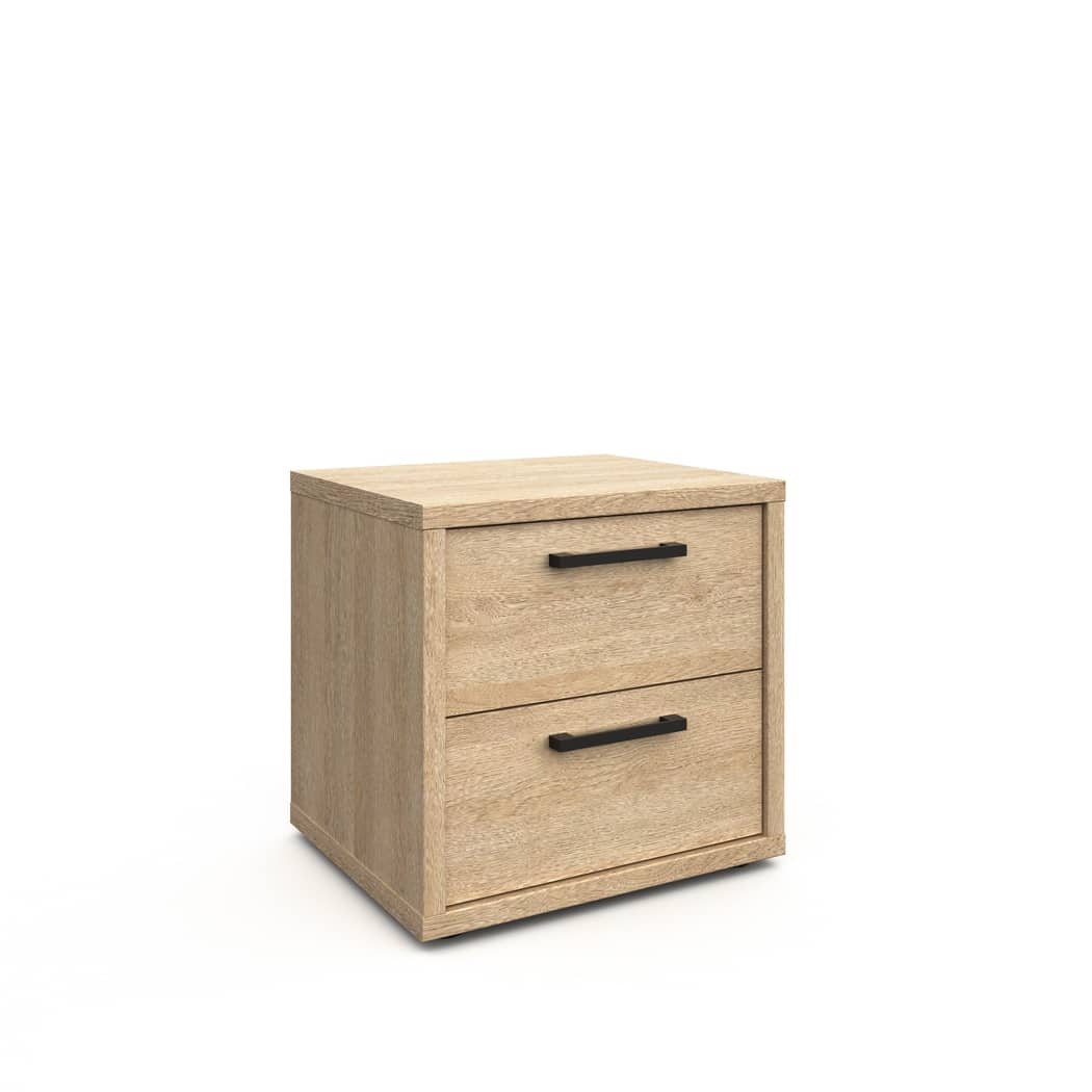 De nachttafel Tessa in zandeik is de ideale aanvulling naast het bed.
