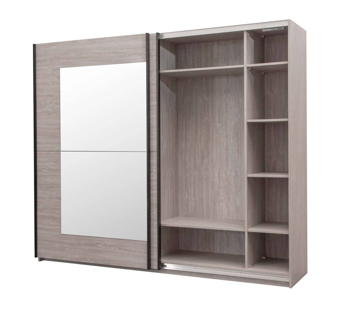 Deze schuifdeurkast heeft centraal op de 2 schuifdeuren een spiegel.