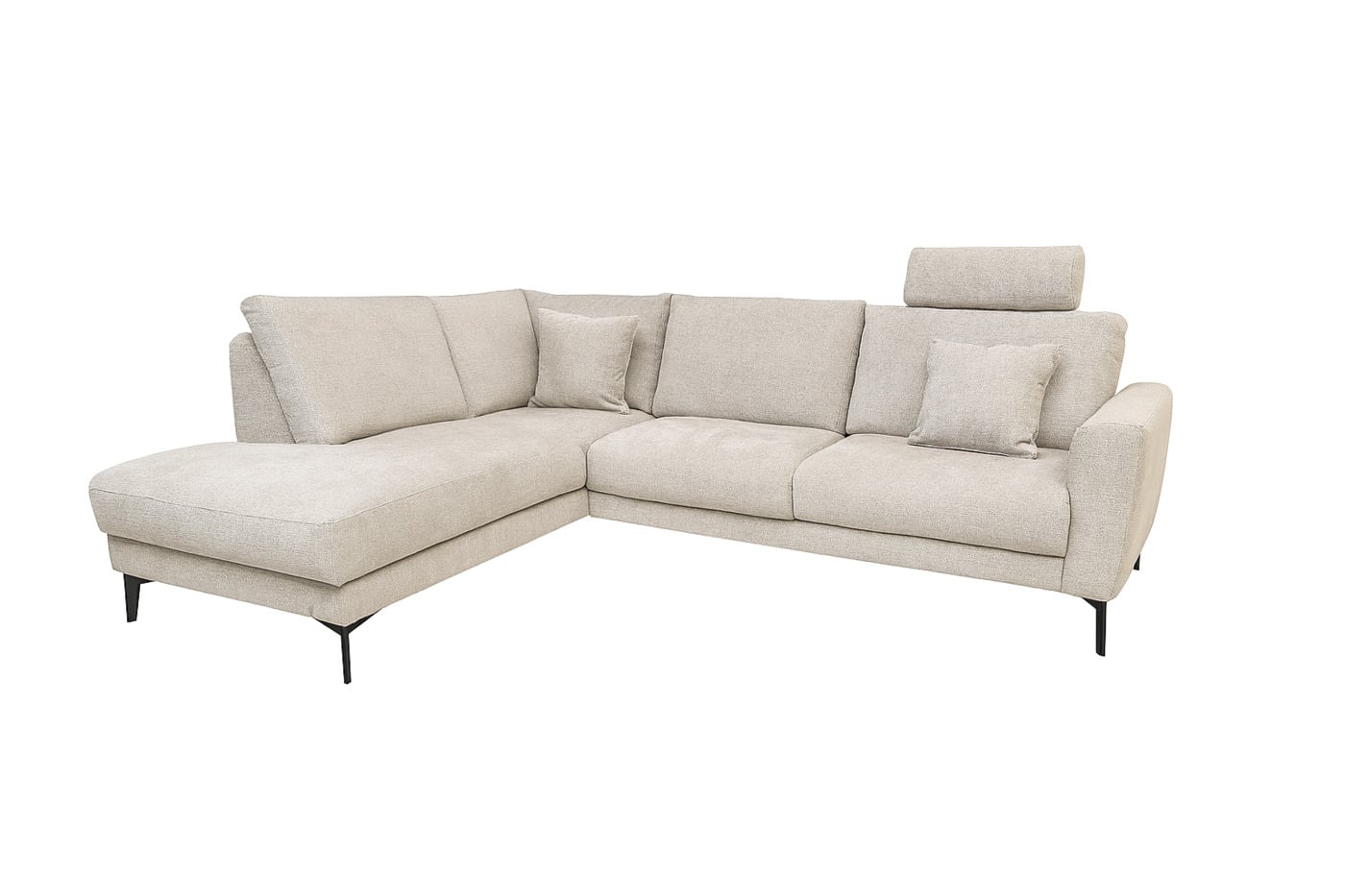 Deze elegante hoekopstelling, afgewerkt in een zachte, neutrale stof, straalt rust en verfijning uit.