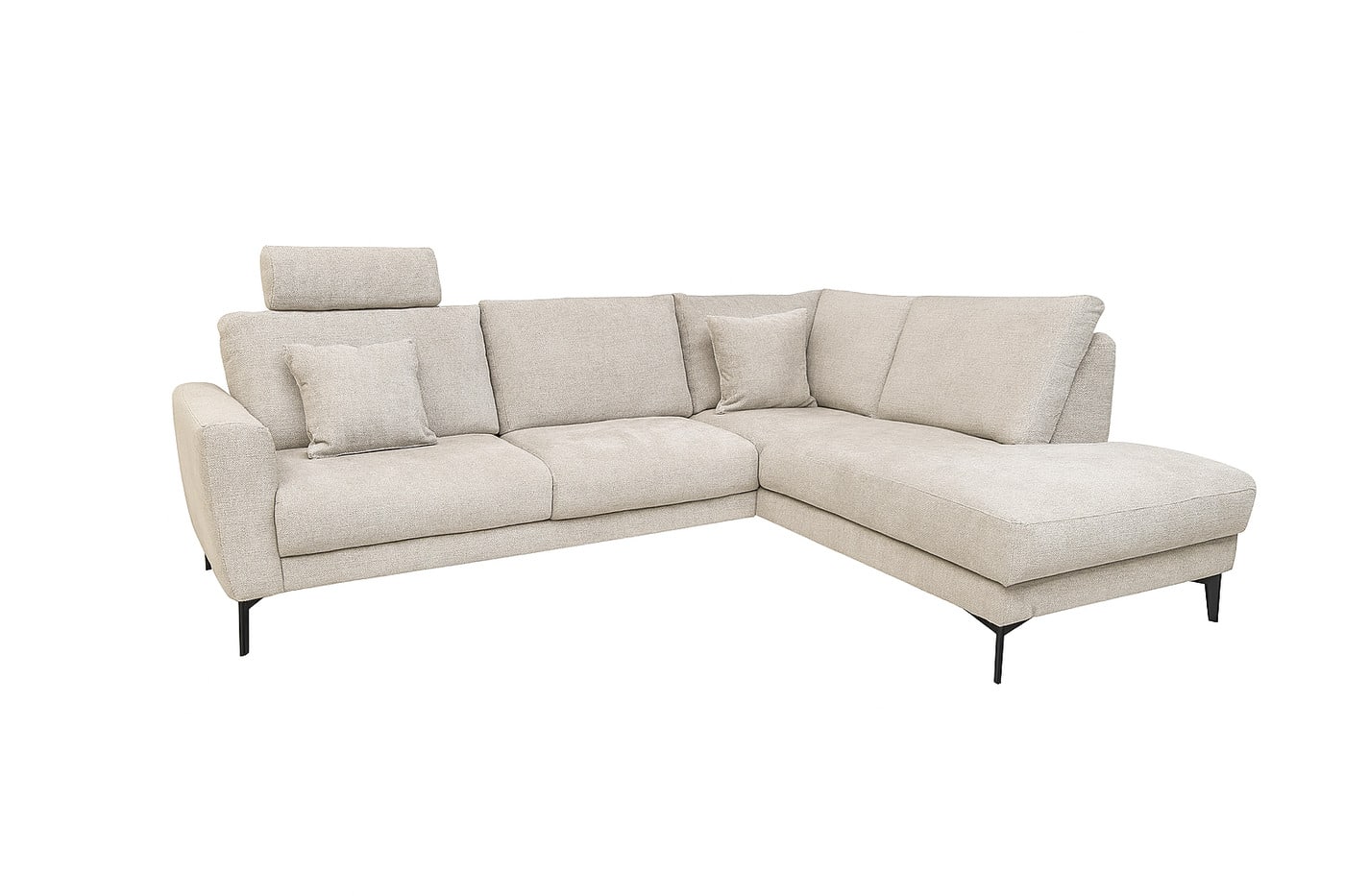 Deze elegante hoekopstelling, afgewerkt in een zachte, neutrale stof, straalt rust en verfijning uit.