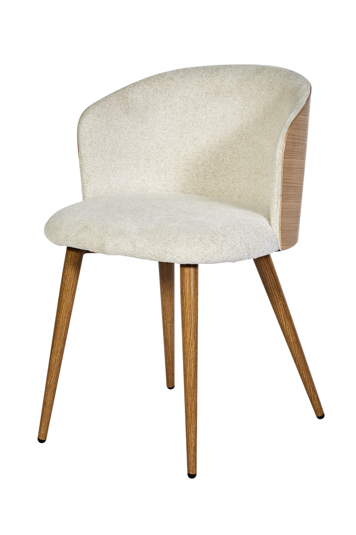 Deze stijlvolle stoel is bekleed met zachte witte stof en heeft een gebogen rugleuning met houten afwerking voor extra luxe.