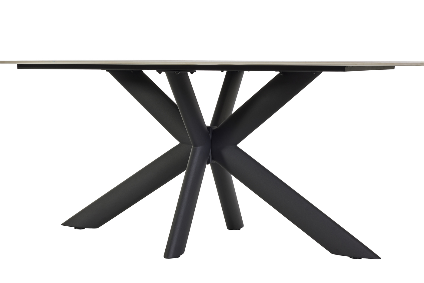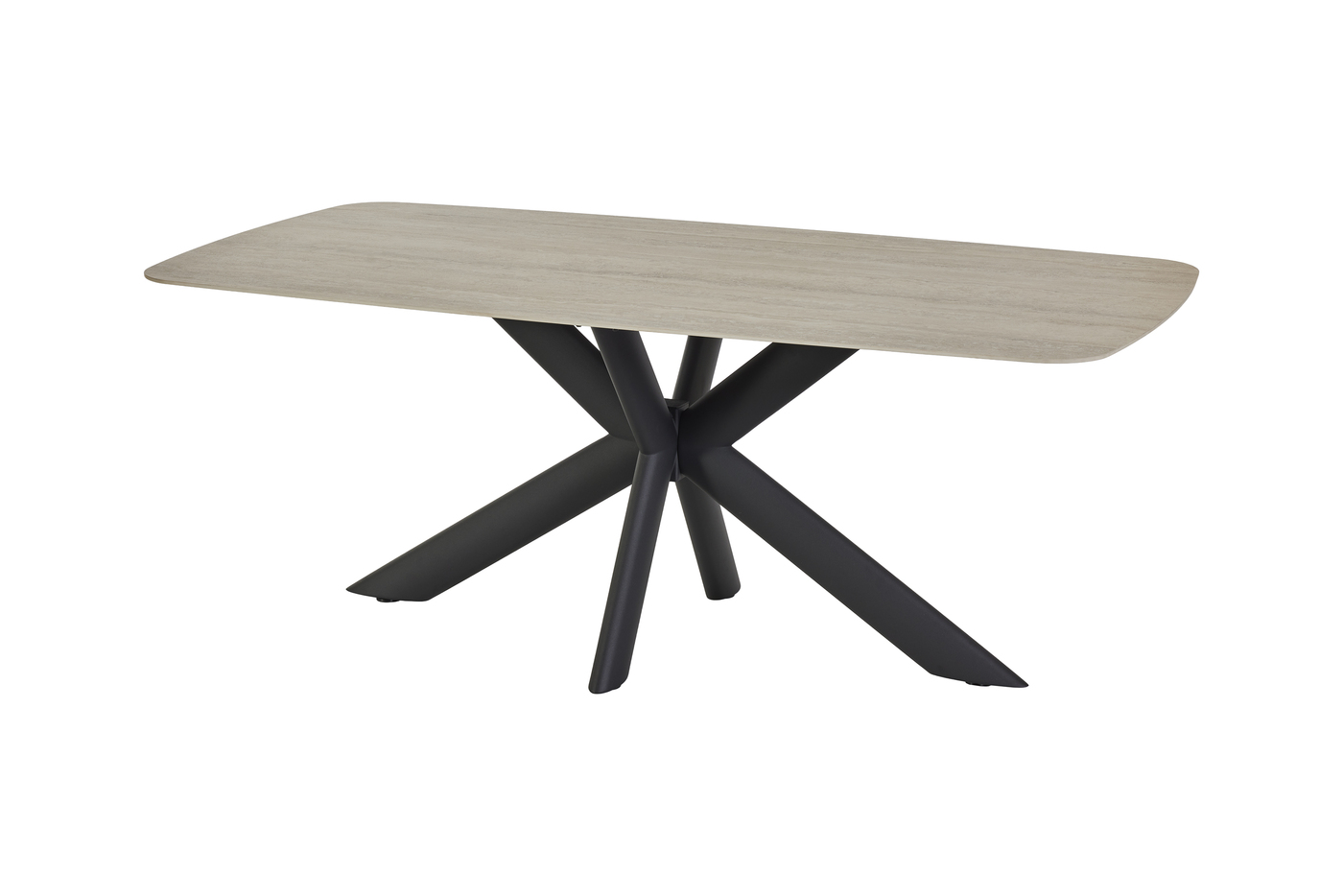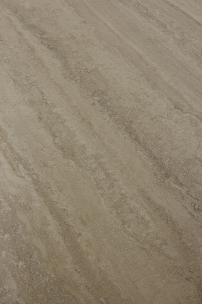 Het keramische tafelblad in travertin look straalt warmte en elegantie uit, terwijl het opvallende centrale onderstel zorgt voor een krachtig en modern silhouet.