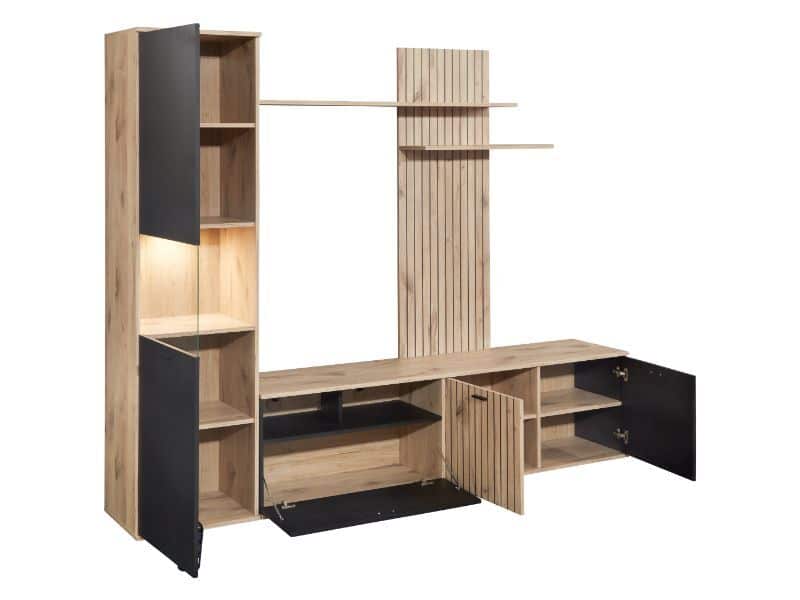 De wand bestaat uit meerdere opbergmodules, open vakken, gesloten kasten en zwevende legplanken – ideaal om je televisie, media-apparatuur en decoratie netjes en stijlvol te organiseren.