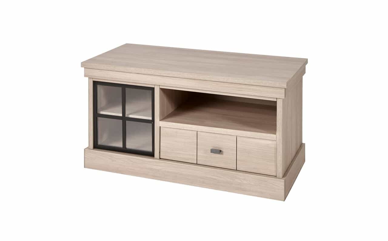 Het eikenkleurige TV-meubel biedt volop opbergruimte en is afgewerkt met glazen vitrinekasten die sfeervol worden verlicht, ideaal om uw mooiste stukken in de kijker te zetten.